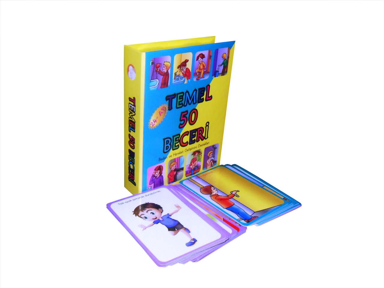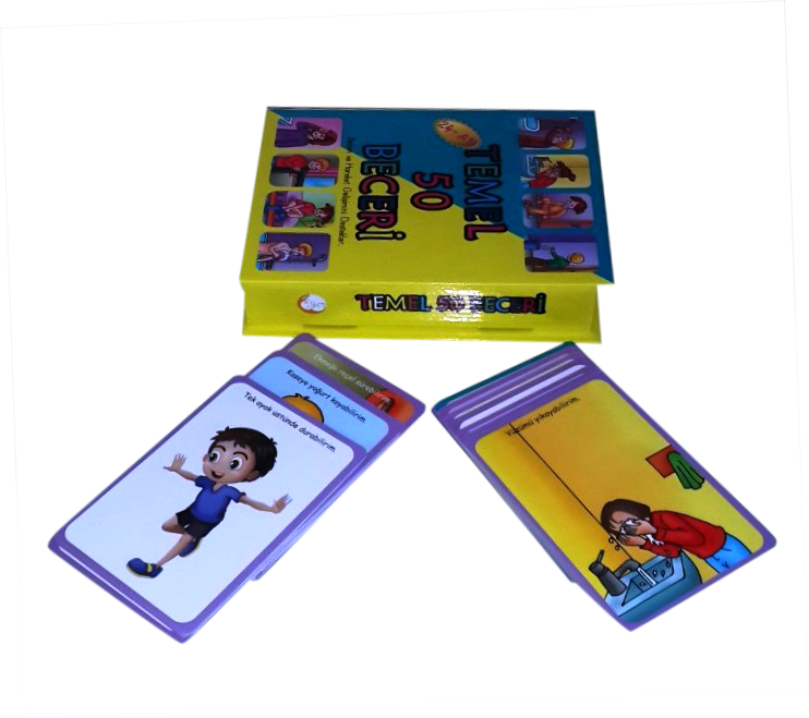 Temel 50 Beceri Kartları, 2 yaş ve üzeri bebeklerin ve küçük çocukların bilişsel ve konuşma becerilerini görsel yolla desteklemek amacıyla tasarlanmıştır. Bu set, 25 adet kart (her kartta iki resim olmak üzere toplam 50 resim) içerir. Kart ölçüleri 12.8x9 cm olup, setin tamamı 15x20x4 cm boyutlarında dayanıklı bir mukavva muhafaza kutusunda sunulmaktadır.